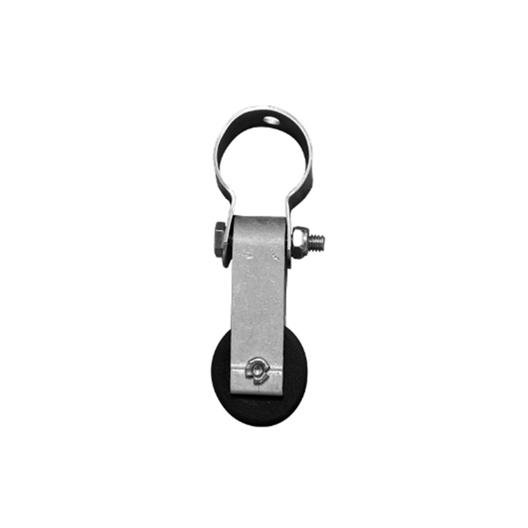 Acessório Roldana de Nylon Superior, composto por abraçadeira de ferro, suporte em alumínio e roldana injetada.