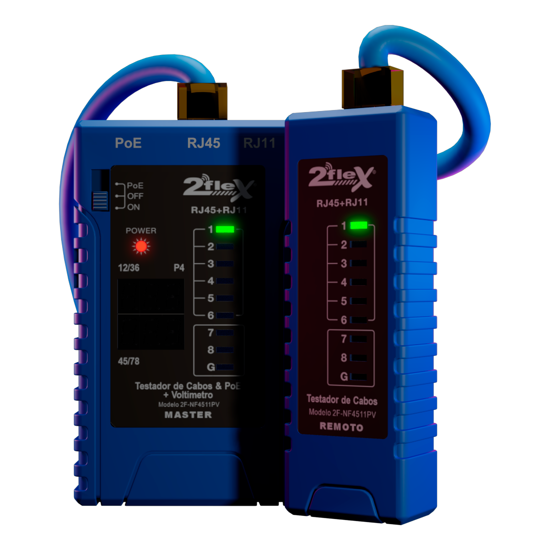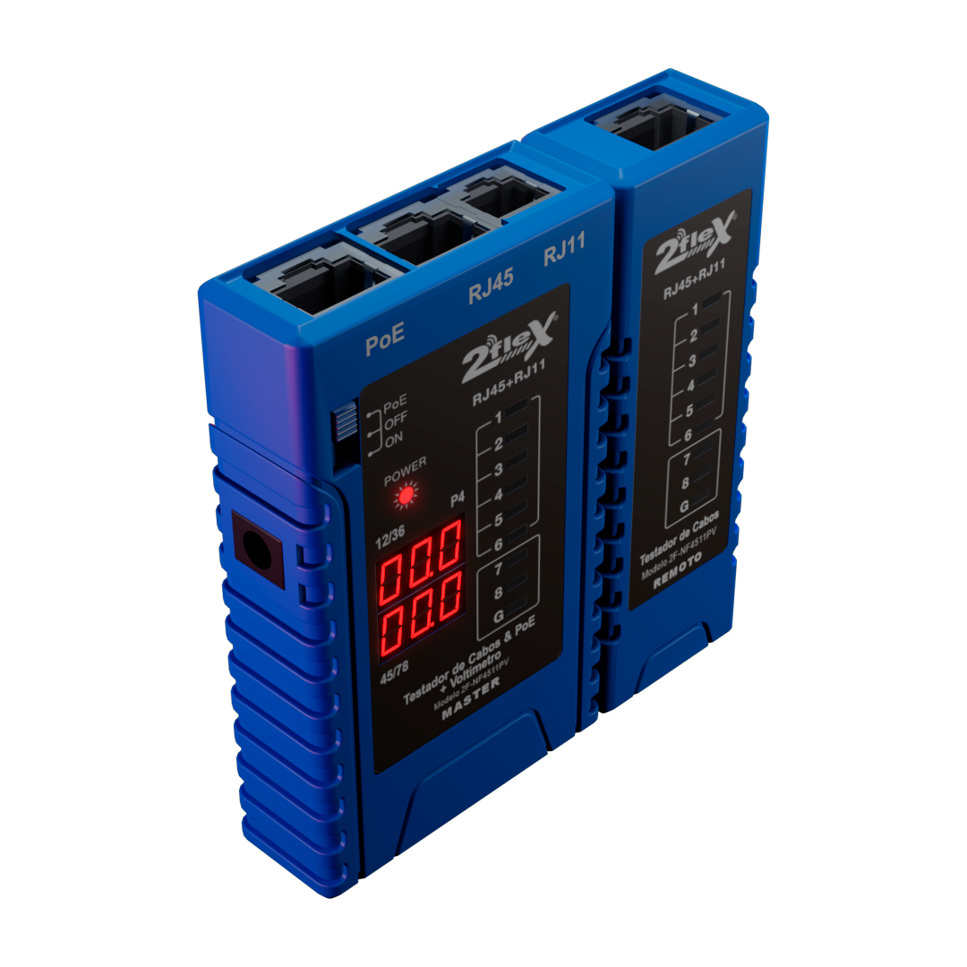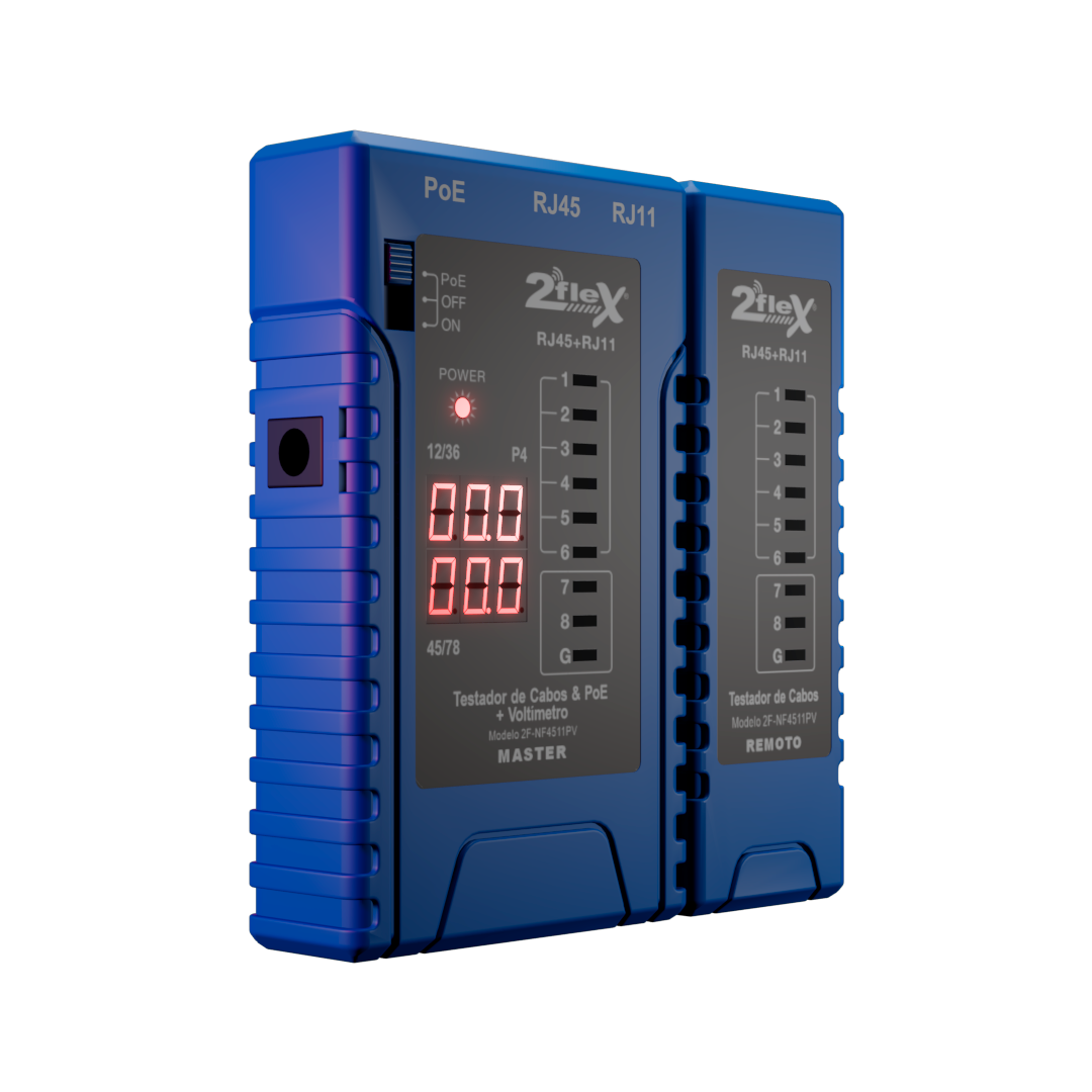 O Testador de Cabo com PoE + Voltímetro, modelo 2F-NF4511PV é o equipamento que auxilia os profissionais nos testes de cabos com conectores RJ11 ou RJ45.